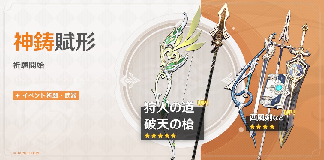 期間中、新★5武器「弓・狩人の道」、★5武器「長柄武器・破天の槍」などの出現率が大幅にUPします。